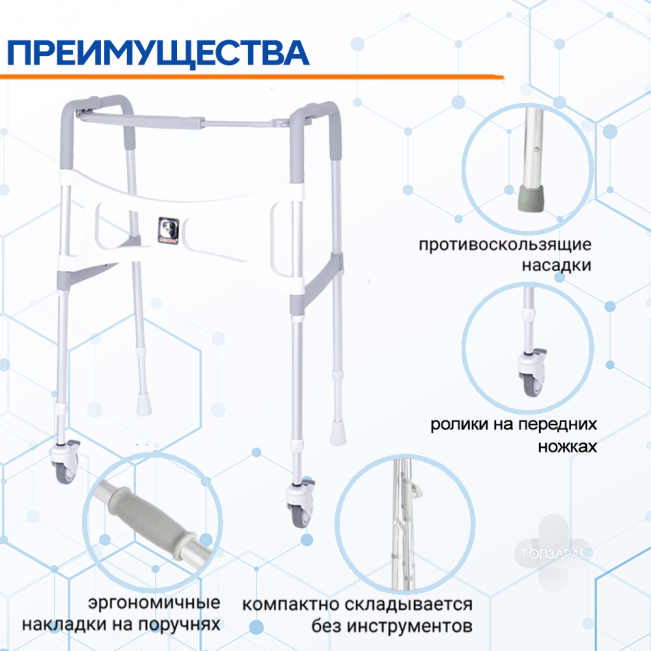 Передние опоры оснащены колесиками, задние — наконечниками с антискользящими свойствами. Такая конструкция позволяет без последствий переносить большую часть веса на опору и при этом не испытывать дискомфорта. В устройстве есть шумопоглощающая гайка. Поэтому ходунки можно использовать как в помещении, так и на улице. Регулируются по высоте на 10 позиций. Выдерживают нагрузку до 100 кг включительно.